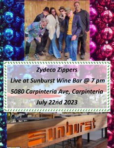 We’re happy to announce that the Zydeco Zippers band will perform live at Sunburst Wine Bar in Carpinteria CA at 7 pm on July 22nd 2023. Bring a friend and we’ll all have fun sippin and dancin the night away to your favorite Zydeco, Mardi Gras, Funk, Blues, and everything in between tunes.